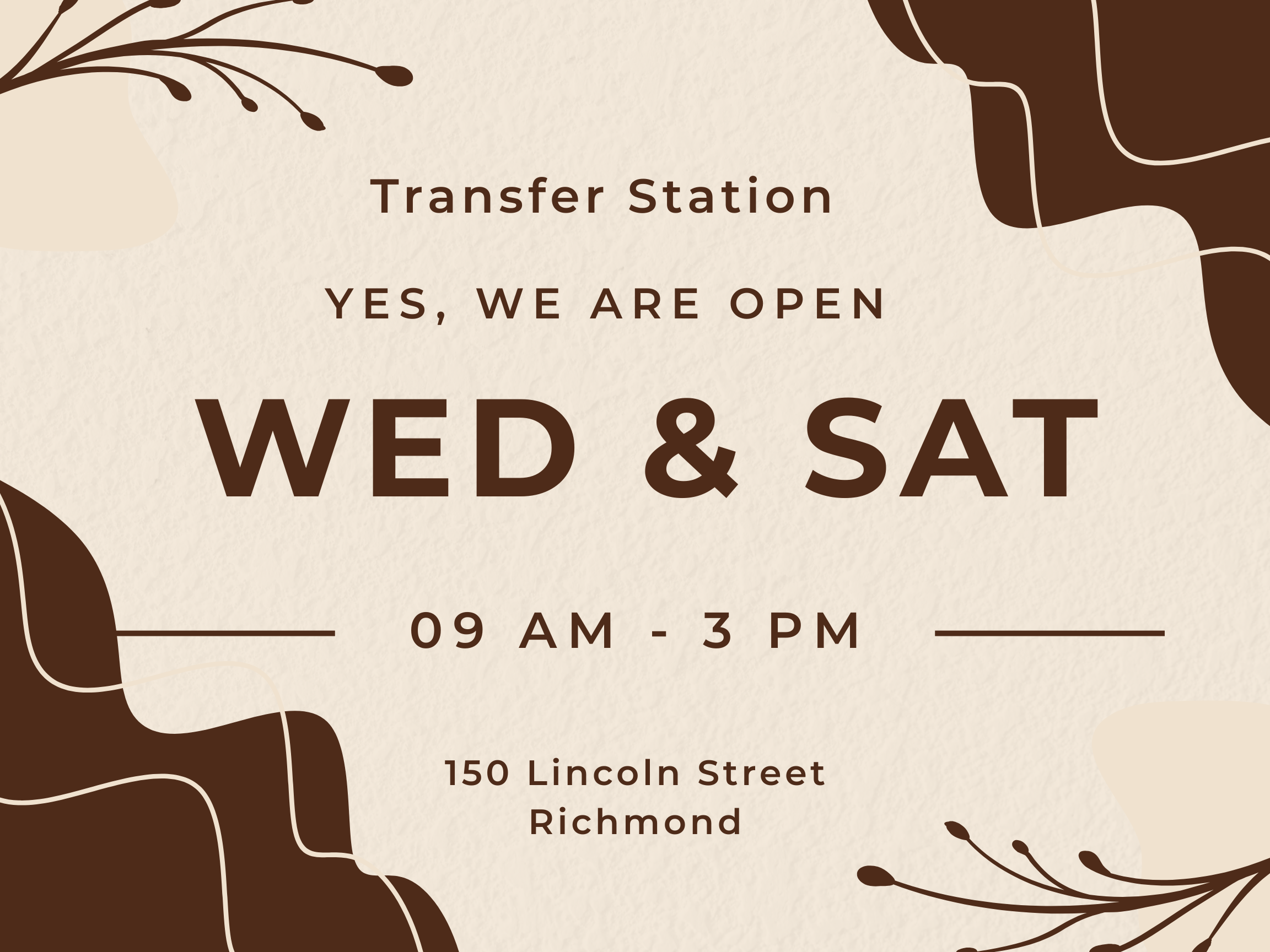 The Transfer Station Hours are Wednesday & Saturday 9A - 3P